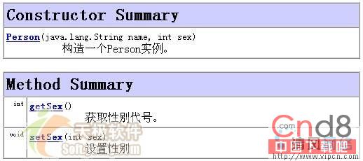 第20~27是类构造函数的注释,构造函数有两句描述信息,第一句是"构造一个Person实例。"第二句是"设定Person的名字和性别。",在构造函数的摘要列表中仅会显示第一句描述信息,用"。"分隔每句描述信息。而在构造函数的具体说明部分,则会显示所有的描述信息。这个原则同样适合于变量、方法的摘要,请看下面Javadoc帮助文档中关于方法摘要及方法具体说明,如图26-6,图26-7所示:
