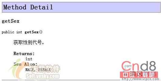 第35~40、45~48为方法的注释,@return为方法返回类型的说明,前面我们已经提到Javadoc文档包含了一个方法摘要列表,每个方法还对应一个具体描述部分,如getSex()的具体描述如下: