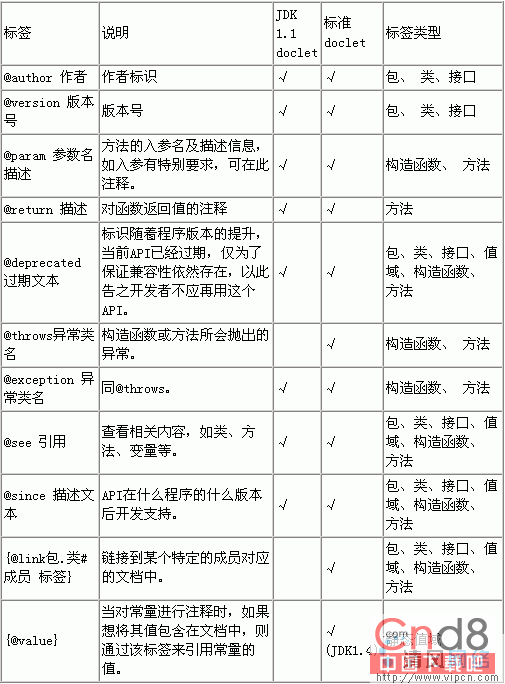 不同版本的JDK所支持的Javadoc标签是不一样的,此外还可以按标签适用的地方分成不同类型,如只适用于方法的@return标签,我们称之为方法标签,只适用于变量的@serial标签,我们称之为值域标签,以此类推。往往一个标签适用于多种地方,下表对常用Javadoc标签进行说明: