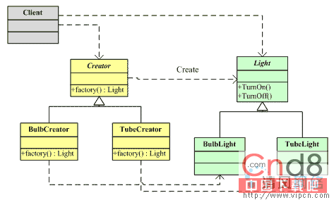 具体工厂(Concrete Creator)角色:这是实现抽象工厂接口的具体工厂类,包含与应用程序密切相关的逻辑,并且受到应用程序调用以创建产品对象。在上图中有两个这样的角色:BulbCreator与TubeCreator。
