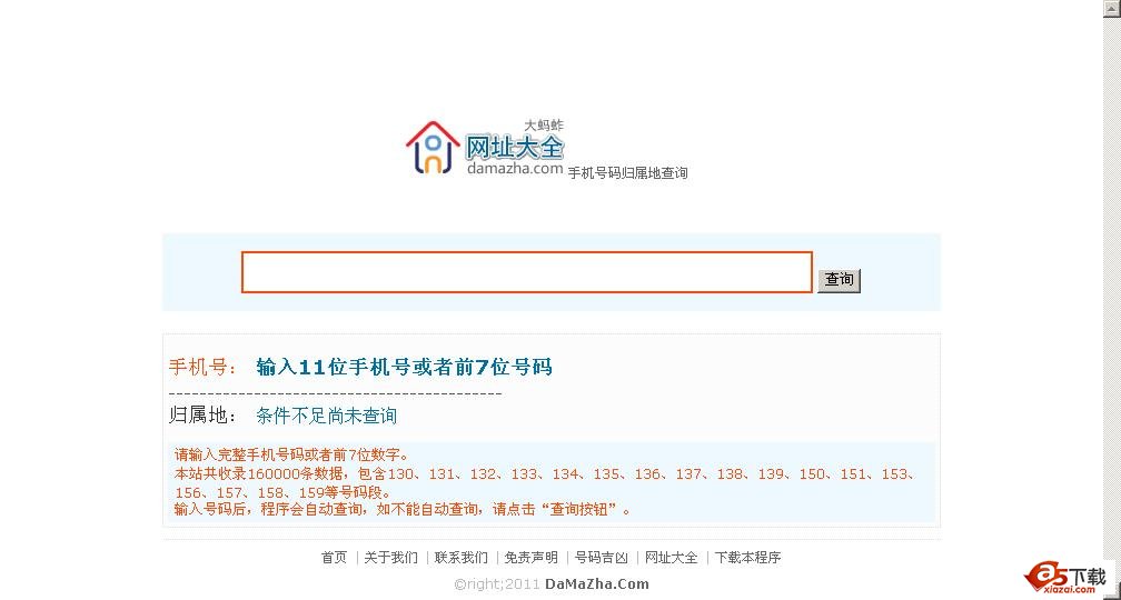 手机号码归属地查询:PHP+MYSQL。 br / 主要功能: br / 1、输入手机号码查归属地; br / 2、DIV+CSS模板方便修改; br / 3、免费、开源程序。 br / 4、速度极快。 br / 演示:http://www.damazha.com