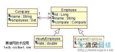 在域模型中,类与类之间除了关联关系和聚集关系,还可以存在继续关系,在图14-1所示的域模型中,Company类和Employee类之间为一对多的双向关联关系(假定不答应雇员同时在多个公司兼