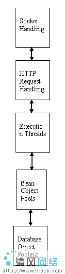 来考虑一下应用服务器的内部机制。应用服务器的基本功能包括事务治理、数据持久、对象池、SOCKET处理和请求处理。这些功能的流程如图4。有各种组件来处理这些功能。这些组件需要同步应用服务器中的线程来维护数据的一致性并操作数据。虽然这种同步对应用服务器的功能正确性是必须而且有用的,但是也成为高负载的限制,即使有足够的硬件资源。