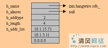 }; 这是个典型的底层APIs使用的数据结构,很多人都不是很熟悉它。实际上,hostent是一个变长的数据结构,h_name是主机名,在例子程序中的值为 "zxn.hangwire.sdb"。没有别名(h_aliases)。h_addrtype是地址类型(或者也叫地址家族),在例子程序中的值为2(AF_INET = internet,其它内容参见winsock.h)。h_length是每一个地址的长度,以字节为单位。因为IP地址的长度是4个字节,所以在例子程序中的值为4,h_addr_list是地址数组的开始点,它们一个接着一个存放,结尾是一个null。每一个x.y.z.w数字占一个字节。为了将IP地址格式化为x.y.z.w的形式,必须将地址数组先拷贝到一个叫sockaddr的数据结构中,然后调用一个非凡的函数inet_ntoa。 图二是hostent 结构在内存中存放示意图: