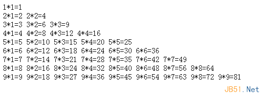 <?php for($i=1;$i<=9;$i++) { for($j=1;$j<=$i;$j++) { echo “$i*$j=”.$i*$j.' ‘; } echo ‘<br />'; } ?>