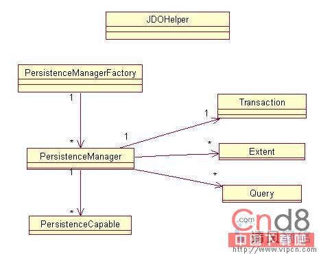 JDOHelper :Javax.jdo.JDOHelper类拥有一些静态的助手(helper)方法。这个方法可以获得一个持久对象的生命周期还可以用来创建一个与具体实现厂商无关的PersistenceManagerFactory的实例,这里使用了工厂(factory)模式。