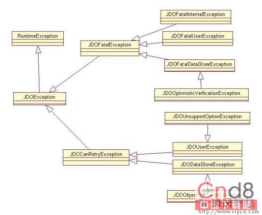 JDO不会抛出通常的运行时异常,比如NullPointerExceptions、 IllegalArgumentException等它只抛出JDOException异常。JDOExcetion的结构如下图所示,这是一个继续的层次结构,从他们的字面含义就可以看出它们的用途,在这里就不具体说了,要想了解JDO异常的层次结构可以参考它们的JavaDoc。