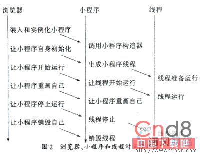 stop( ) 中 终 止 线 程 运 行, 这 样 当 用 户 不 查 阅 时 不 会 占 用 处 理 器 资 源。 图2 表 示 浏 览 器、 小 程 序 和 线 程 之 间 的 关 系。