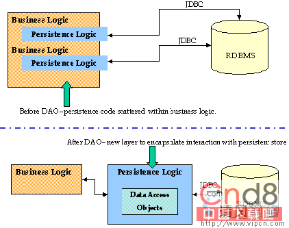 数据访问对象(DAO)是一个集成层设计模式,如Core J2EE Design Pattern 图书所归纳。它将持久性存储访问和操作代码封装到一个单独的层中。本文的上下文中所提到的持久存储器是一个RDBMS.