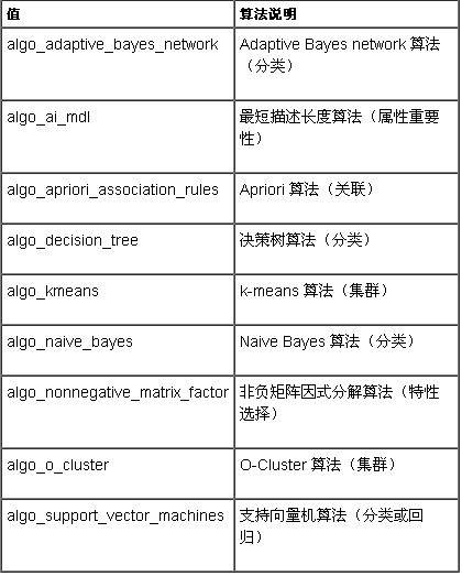 DBMS_DATA_MINING 程序包包含若干过程,包括 CREATE_MODEL 和 APPLY。CREATE_MODEL 过程根据设置表(作为过程的参数之一提供)中的值为给定挖掘函数和数据集创建挖掘模型。该过程简单且易于使用。实际上,由用户来为要创建的模型、要使用的挖掘函数、包含要使用的数据的表、要建模的列以及设置表提供名称。这一方法的优点在于所有不同算法都可以类似的方法调用。每种算法的微调都整合至设置表中,但在很多情况下,各种设置系数可由算法本身自动决定。设置表中条目的复杂性根据用户的专业技术背景和算法而有所不同。许多专业用户可能希望手动设置所有可能的系数,而我们中的多数人更可能乐意系统自动给出适用设置。Oracle 提供了一个要用作设置键的常量列表,以及命名为常量或数字间隔的值。