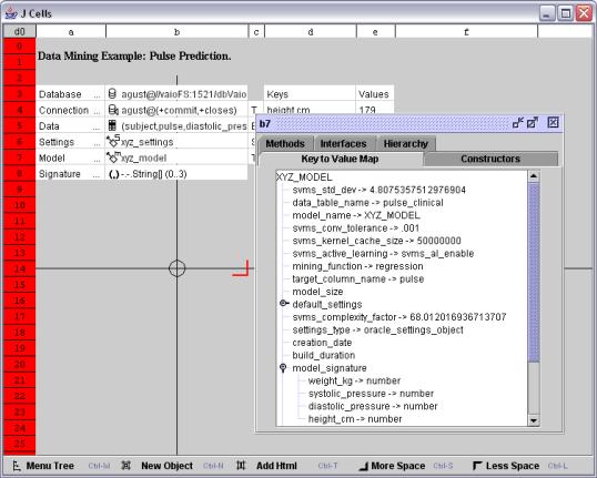 因此,来看一个在该系统中编写的小数据挖掘模型,该模型可通过访问 Oracle 数据库创建并运行 ODM (Oracle Data Mining) 回归模型。该回归模型的用途是根据输入(例如血压、高度和体重)预测心率。使用 J Cells 可直接访问 Java API 以实例化对象并在对象上调用方法。首先,连接至 Oracle 数据库。DataSource 对象可通过将以下公式