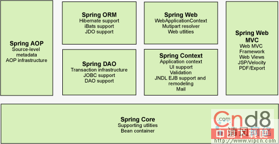 组成 Spring 框架的每个模块(或组件)都可以单独存在,或者与其他一个或多个模块联合实现。每个模块的功能如下: