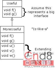 若按这种思路考虑问题,那么一个纯粹的“属于”关系似乎是唯一明智的设计方法,其他任何设计方法都会导致混乱不清的思路,而且在定义上存在很大的困难。但这种想法又属于另一个极端。经过细致的研究,我们发现扩展接口对于一些特定问题来说是非凡有效的方案。可将其称为“类似于”关系,因为扩展后的衍生类“类似于”基础类――它们有相同的基础接口――但它增加了一些特性,要求用额外的方法加以实现。如下所示: