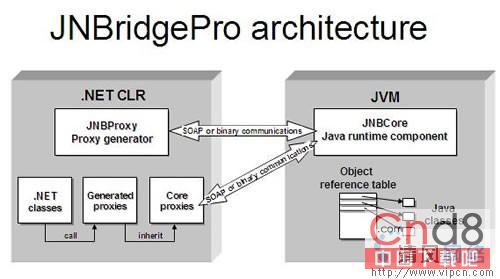 JNBridge透过对应的执行时期模块与代理程序(proxy),.NET程序可以在不需要Java原始程序的状况下与这些组件进行互通、继续,并将其视为同一个程序内的.NET组件。