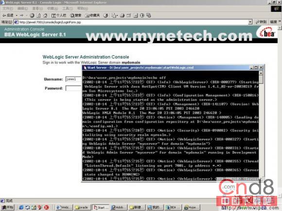 点击"开始/程序/BEA WebLogic Platform 8.1/User Projects/mydomain/Start Server"会弹出如(图四)的DOS弹出窗口,并一直保持,没有异常报错,那就要恭喜你了,你的Weblogic已经正常启动了,Weblogic的基本安装和配置就算完成了。