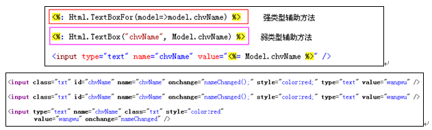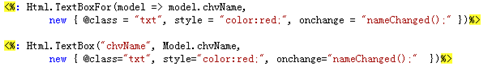 注意:Html辅助方法有很多种重载形式,在开发过程中可以根据实际需要自行选择.比如要实现一个包含class\style\onchange属性和事件的单行文本框,可以参考如下代码: