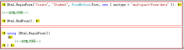 生成form标记的两个Html辅助方法为:Html.BeginForm()和Html.EndForm(),但他们在使用时和其他的Html辅助方法有所不同,下面的示例代码演示了它们的两种用法: