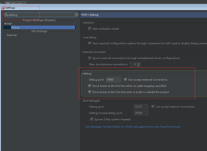这里的debug port要和php.ini里面的 xdebug.remote_port相一致!默认是9000,如果9000端口被占用的话,可以改成其他端口。