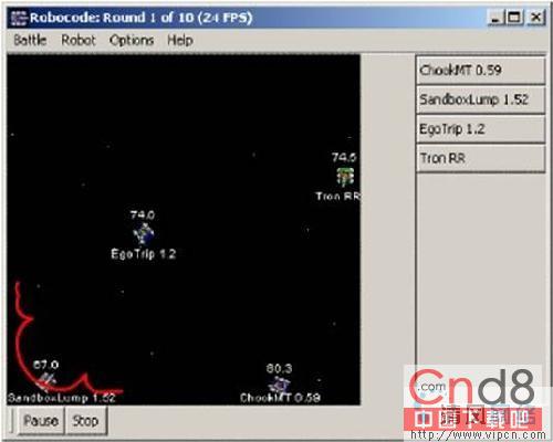 他虽然总是做弧线运动,但是这次弧线运动停止后又会开始另一个方向的弧线运动。可能你看了Crazy的源代码后你会怀疑,代码里面一个类似Math.random()的语句都没有,怎么称这种运动是随机性很强的运动呢?这里的随机性是相对于你的机器人的运动分析程序的:由于他总是时而转动,时而停止换一个方向,时而向前,时而向后,撞到墙又会改变方向。一般的机器人都难以分辨这种改变,所以通常也称它为随机的运动。