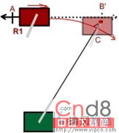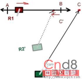 假如机器人R1在A,B之间作直线往返运动,某一时刻机器人R1和机器人R2在如图所示位置,R1目前是直线运动。假如R1的摆幅小于R1到R2的距离,R2用直线提前量的射击方法,射击点在B点右边的C点,它发射了子弹,但是R1运动到B点的时候忽然反向向A行驶,到达A后又返回向B行驶,如此反复,R2的子弹就总是打在A点偏左或者B点偏右的地方。这就是往返运动的迷惑性,哈哈,R1能迷惑敌人了,它很强了吧?不,假如R1的摆幅大于R1与R2的距离。如图所显假设R2在R2’的位置,它计算的射击点C’在AB之间,这样的话则可以击中敌人,所以往返运动也不一定总能使敌人打偏,靠你比较近的敌人就显得非常危险。还有优秀的机器人一般能识别往返运动的敌人,它能计算出你往返的距离,这样你可能就被别人百发百中了。所以假如你要采用这样的方法的话,可以添加一些其他因数,比如说弧线往返运动,往返运动随机距离等等。