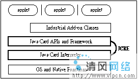 在此软体架构中,最底层的OS and Native Functions 是负责低阶的处理工作,如同今日的作业系统。而在上面两层Java Card Interpreter与Java Card APIs and Framework就是我们所谓的JCRE,主要负责执行Java Card applets以及提供 applet执行所 要的环境。而 Industry Add-on Classes则是 service provider 所提供的classes,使得企业与公司能够提供属於自己的服务程式。
