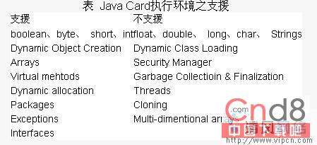 因为受限於体积与 resource,所以 Java Card在执行环境上的支援是相当有限的,表即 Java Card执行环境的支援现况,其他具体内容请参考 references。