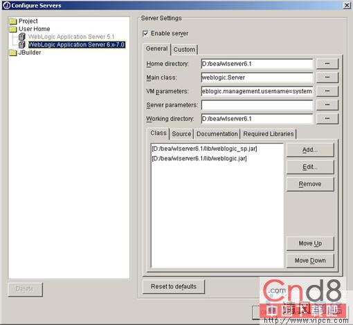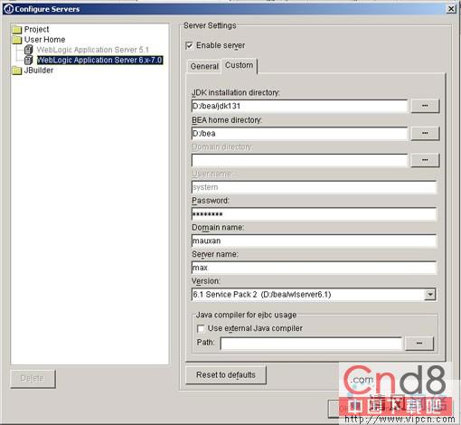 在下面的user Home下,你可以看到“webLogic Application Server 6.X-7.0”项,点击它,在右边会出现Server Settings ,将Enable server打上勾,在下面的General下选择home Directory和Working directory:本人的为"D:/bea/wlserver6.1"