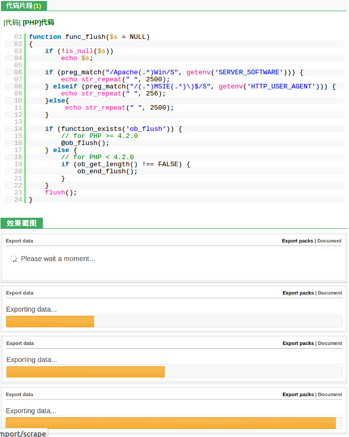 echo '<script language="javascript">$(“#progressbar”).css(“width”,“完成进度%”);</script>'; func_flush(); //该方法会使前面的echo实时输出到客户端。