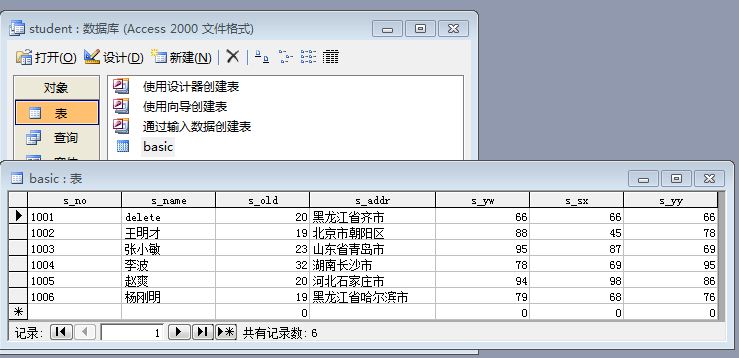 例如有如下的Access数据库student,表basic,以及6条记录,现在通过几种方式在Jsp中将他们的数据显示出来。如图所示: