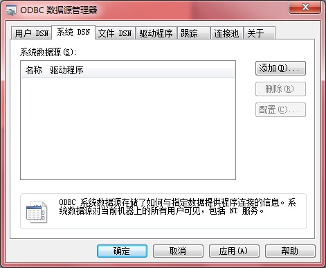 1、对于这种方式,首先要建立ODBC数据源,我的系统是Win7系统,所以依次选择“控制面板----管理工具----数据源(ODBC)”,打开数据源管理器,如图所示: