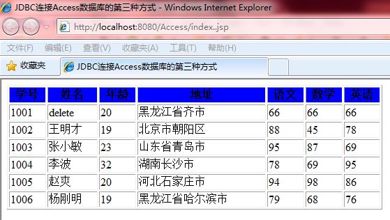 <%@ page language="java" import="java.util.*,java.sql.*" contentType="text/html; charset=UTF-8" pageEncoding="UTF-8"%><!DOCTYPE html PUBLIC "-//W3C//DTD HTML 4.01 Transitional//EN" "http://www.w3.org/TR/html4/loose.dtd"><html> <head> <title>JDBC连接Access数据库的第三种方式</title> </head> <body> <table border="1" width="40%"> <tr bgcolor="blue"> <th>学号</th> <th>姓名</th> <th>年龄</th> <th>地址</th> <th>语文</th> <th>数学</th> <th>英语</th> </tr> <% String path = application.getRealPath("/index.jsp"); path = path.substring(0,path.lastIndexOf("\\"))+"\\"; Class.forName("sun.jdbc.odbc.JdbcOdbcDriver"); String url = "jdbc:odbc:driver={Microsoft Access Driver (*.mdb)};DBQ="+path+"student.mdb "; Connection con = DriverManager.getConnection(url); Statement st = con.createStatement(); String sql = "select * from basic"; ResultSet rs = st.executeQuery(sql); while(rs.next()) { %> <tr> <td><%=rs.getString(1) %></td> <td><%=rs.getString(2) %></td> <td><%=rs.getInt(3) %></td> <td><%=rs.getString(4) %></td> <td><%=rs.getInt(5) %></td> <td><%=rs.getInt(6) %></td> <td><%=rs.getInt(7) %></td> </tr> <% } rs.close(); st.close(); con.close(); %> </table> </body></html>