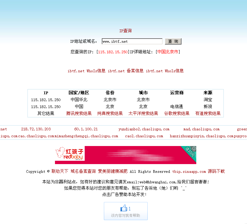 if($whois){echo "<br /><br /><a href='http://2.tbip.sinaapp.com/whois.php?d=".$whois."' target='_blank' title='数据来源于本站WhoIs信息查询接口'>".$whois." WhoIs信息</a> <a href='http://www.ddung.org/tool/icp/index.php?k=".$whois."' target='_blank' title='数据来源于迷糊工具网 www.ddung.org备案信息查询接口'>".$whois." 备案信息</a> <a href='http://72e.hbwanghai.com/domain/who_single.aspx?DomainName=".$whois."' title='数据来源于联动天下72e.hbwanghai.com WhoIs信息查询接口' target='_blank'>".$whois." WhoIs信息</a>";}$sinaip=sinaip($ip);if($whois){cacheip($whiosip);}else{cacheip($ip);}