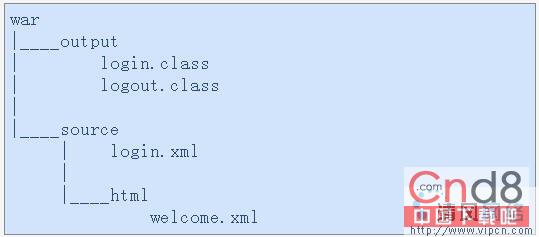 例8-1当中使用的build文件将会把你需要部署的应用创建在.war文件当中,将.class文件放入WEB-INF/classes目录,重新命名login.XML,web.xml文件,并将其放入WEB-INF目录当中,以及其它任务。