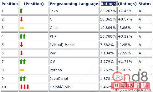 近日来,在TIOBE程序员社区中公布了其2005年11月的程序语言排行榜。这得注重的是PHP即将超过C++成为了排行榜的老三!而Java作为开源先锋首当其冲的成为了龙头老大,并且仍然保持着很好的增长势头。