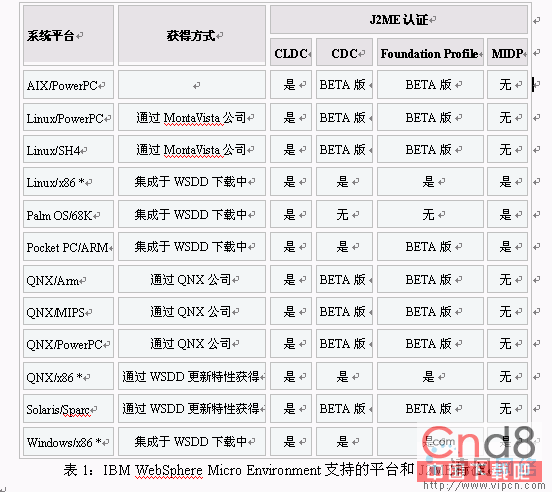 虽然KVM作为Sun的参考实现最经常被提到,不过并不等于一定要用KVM。其它公司的虚拟机只要满足相应的Configuration里的定义,通过兼容性测试,一样可以作为Configuration的虚拟机。目前IBM WebSphere Micro Environment,已经通过了"Java PoweredTM"认证,其J9虚拟机在相当多的平台上通过了J2ME兼容性测试: