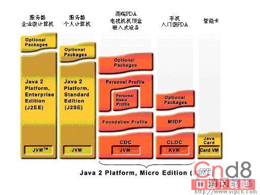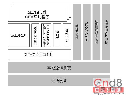 应该注重到,J2ME要支持的硬件平台也有很大差异,其中有比较高端的设备,例如电视机的机顶盒、网络电视等;也有比较低端的,象手机、寻呼机等。因此为了满足不同硬件的开发要求,J2ME规定了configuration的概念,Configuration对不同级别的硬件在所使用的JVM和基础API集合方面做了规定。于是,对于高端的设备,采用CDC(Connected Device Configuration),所使用的JVM称为CVM;对于低端设备,则采用CLDC(Connected Limited Device Configuration),所用的JVM为KVM(参见图1)。