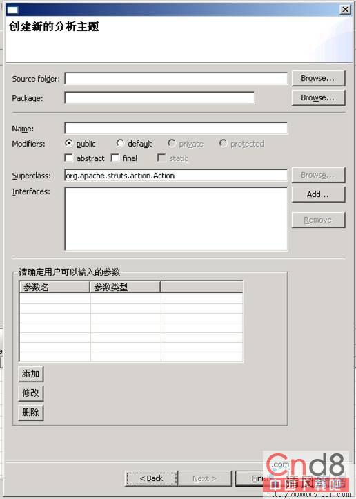 2.首先显示的是生成 Action 类的界面,它扩展了 JDT 插件的功能来答应程序员的输入客户容许的查询条件,而且它已经把父类设定为了可以看到父类 org.apache.struts.action.Action,这是 Struts 的要求.这再后面是用来自动生成 FormBean,和 jsp 表单用的。