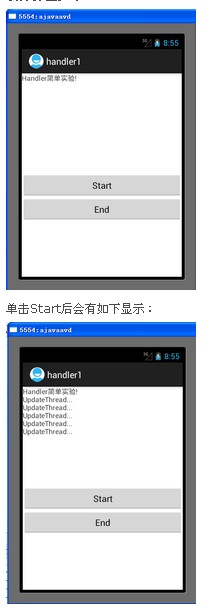 这个例子比刚才那个例子稍微复杂些。因为这个例子中用到了handler的消息队列机制,即通过handler中一个线程向消息队列中用sendMessage方法发送消息,发送的消息当然可以用来传递参数。在handler中用handleMessage来处理消息,处理方法是获得消息队列中的消息参数,用这些参数来完成另外一些功能。