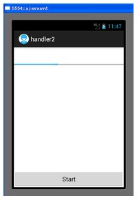 本实验实现的是当开始按钮按下时,会启动一个线程,并绑定到handler中,该线程发送带有参数的message到handler的消息队列中,消息队列的另一端获取该消息,并且用该消息的参数来更新进度条。