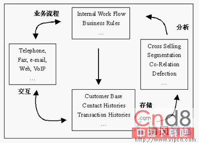 根据系统功能,又可以在CRM系统中划分出交互、存储、业务流程处理和数据分析四个方面(如图1)。