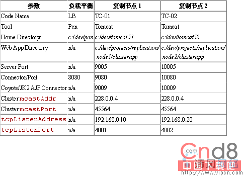 范例集群安装有两个TOMCAT例程和一个负载平衡用于分配服务器间的请求。所有三个服务器都运行在一个单独的机器上,以下表格列出了集群和负载平衡上的配置参数。