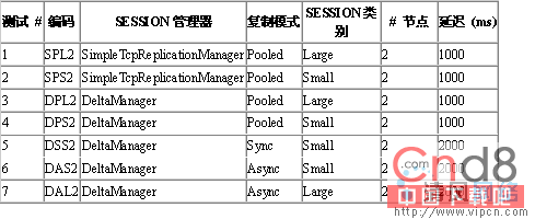测试环境包括使用不同的SESSION治理器(SimpleTcpReplicationManager 或则 DeltaManager)和SESSION复制模式(同步,异步,池),以下表格列出了在TOMCAT集群中的一系列测试环境: