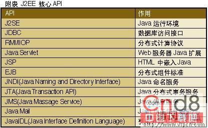 ---- 人们普遍需要一种能够提供通用服务的计算平台,来解决应用开发和部署以及移植过程中的问题。这就像我们生活中碰到的事情一样,例如当您搬到一个新房子里,忽然发现所有的电源插座都和原来房子里的不一样,电压也有所不同,所有的电器必须重新购买!这是不是一件非常麻烦的事情呢?因此,J2EE的好处是显而易见的,也正如开发者所期待的,J2EE提供的核心API覆盖了大部分企业计算需要的服务,开发者不必费力去寻找各种产品的解决方案,也无须学习各种产品独有的API接口,一切都变得更加简单。这也就是J2EE被普遍关注的原因了。J2EE所提供的核心API如附表所示。