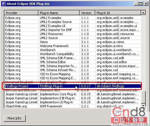 重新启动Eclipse后,在Help => About Eclipse SDK => Plug-in Details你可以看到由“FindBugs Project”提供的“FindBugs Plug-in”版本0.0.17插件,如下图所示: