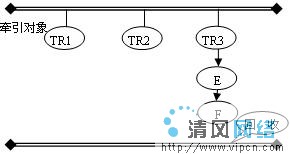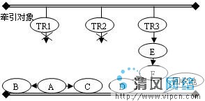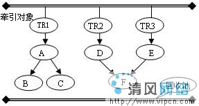 Java的内存回收机制可以形象地理解为在堆空间中引入了重力场,已经加载的类的静态变量和处于活动线程的堆栈空间的变量是这个空间的牵引对象。这里牵引对象是指按照Java语言规范,即便没有其它对象保持对它的引用也不能够被回收的对象,即Java内存空间中的本原对象。当然类可能被去加载,活动线程的堆栈也是不断变化的,牵引对象的集合也是不断变化的。对于堆空间中的任何一个对象,假如存在一条或者多条从某个或者某几个牵引对象到该对象的引用链,则就是可达对象,可以形象地理解为从牵引对象伸出的引用链将其拉住,避免掉到回收池中;而其它的不可达对象由于不存在牵引对象的拉力,在重力的作用下将掉入回收池。在图1中,A、B、C、D、E、F六个对象都被牵引对象所直接或者间接地“牵引”,使得它们避免在重力的作用下掉入回收池。假如TR1-A链和TR2-D链断开,则A、B、C三个对象由于失去牵引,在重力的作用下掉入回收池(被回收),D对象也是同样的原因掉入回收池,而F对象仍然存在一个牵引链(TR3-E-F),所以不会被回收,如图2、3所示。