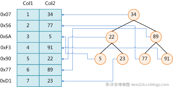 图1展示了一种可能的索引方式。左边是数据表,一共有两列七条记录,最左边的是数据记录的物理地址(注意逻辑上相邻的记录在磁盘上也并不是一定物理相邻的)。为了加快Col2的查找,可以维护一个右边所示的二叉查找树,每个节点分别包含索引键值和一个指向对应数据记录物理地址的指针,这样就可以运用二叉查找在O(log2n)的复杂度内获取到相应数据。