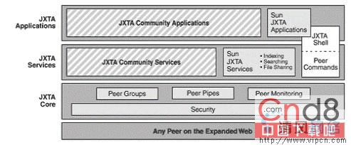 应用层(JXTA Application):这一层包括了应用JXTA服务开发出来的完整的P2P应用程序,例如myJXTA,JXTA-CAD等应用程序。
