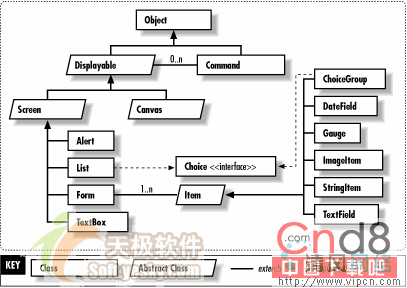如前所述,在用户和设备之间交互的基本单元是screen,它是一个封装了设备相关图形用户输入接口的对象。如在图1的类图中所见,共有四类高层的screen:TextBox,List,Alert和Form。