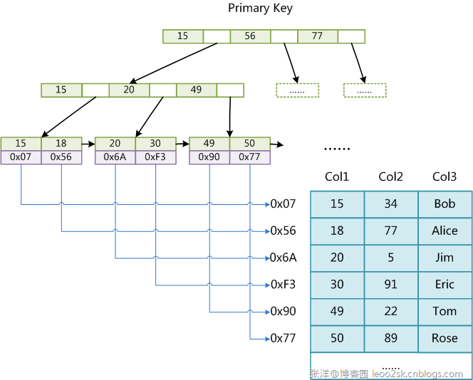 这里设表一共有三列,假设我们以Col1为主键,则图8是一个MyISAM表的主索引(Primary key)示意。可以看出MyISAM的索引文件仅仅保存数据记录的地址。在MyISAM中,主索引和辅助索引(Secondary key)在结构上没有任何区别,只是主索引要求key是唯一的,而辅助索引的key可以重复。如果我们在Col2上建立一个辅助索引,则此索引的结构如下图所示: