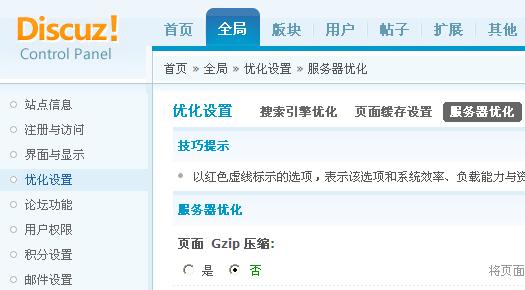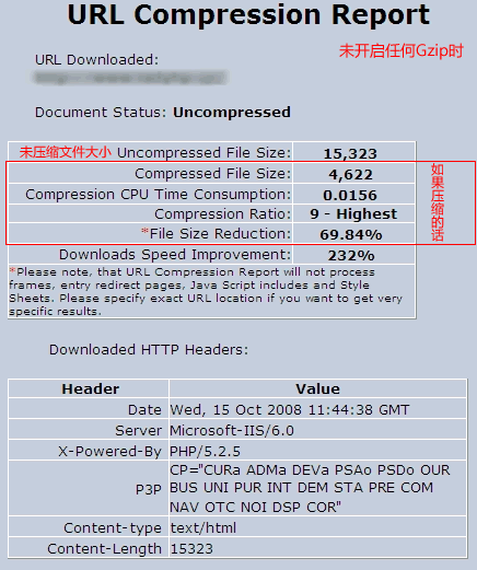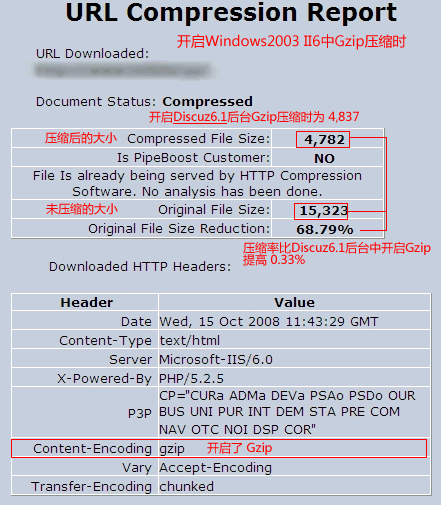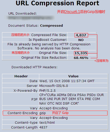 如果不关闭,压缩效果将会降低 0.33% (不关闭,则就是2个Gzip压缩了,而输出时,将优先使用Discuz6.1后台的,所以会下降,一定要关闭)